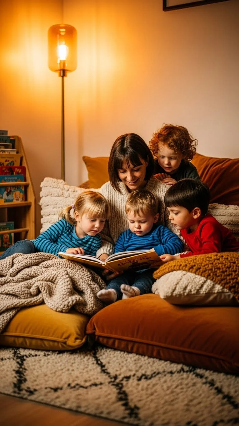 [Image Prompt: A cozy reading nook with pillows and a parent reading a book aloud while kids listen closely. No text.]