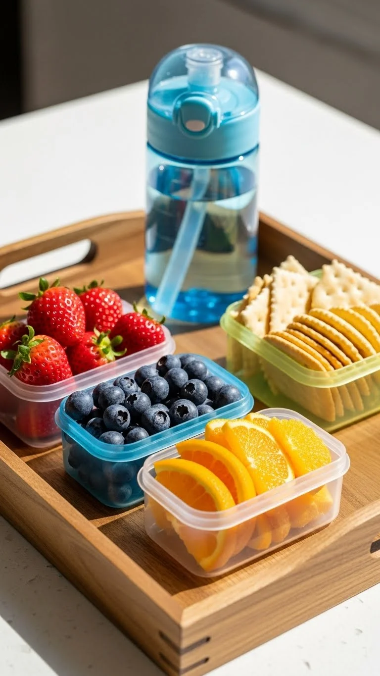 A snack and hydration station keeps kids from asking for food every 20 minutes. Fill small containers with simple snacks in the morning. Use fruits, crackers, or veggies. Set a water bottle for each child on the counter. When they get hungry, they can grab something without interrupting everything you’re doing. This helps afternoons feel calmer. Use dollar-store bins or jars to sort items. Swap options each week so they don’t get bored. Keep the station low, so little ones can reach. You can also place a limit, like two snacks per afternoon, using clothespins or tokens.
