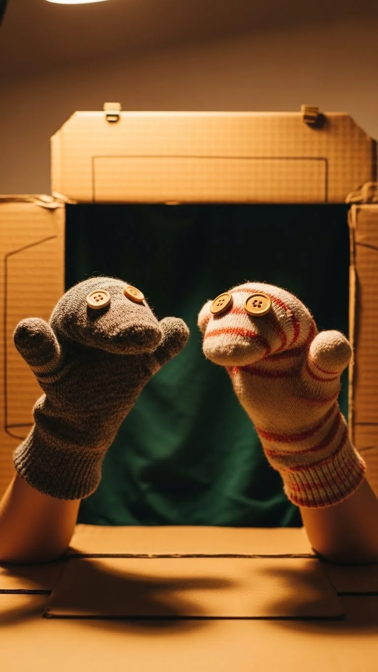 Use clean old socks and leftover buttons or markers. Create simple faces. Make a cardboard box into a puppet stage by cutting out a rectangular opening. Kids can perform short scenes about daily life or silly characters. Keep the stories short so everyone stays engaged. This project sparks imagination without any special supplies.
