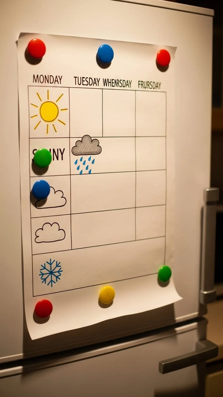 Draw simple weather symbols like clouds, sun, or raindrops. Tape them to cardboard and cut them out. Add magnets to the back. Each morning, ask your child to place the correct symbol on the fridge. Talk about temperature using simple words like “warm” or “chilly.” This creates a steady daily routine.
