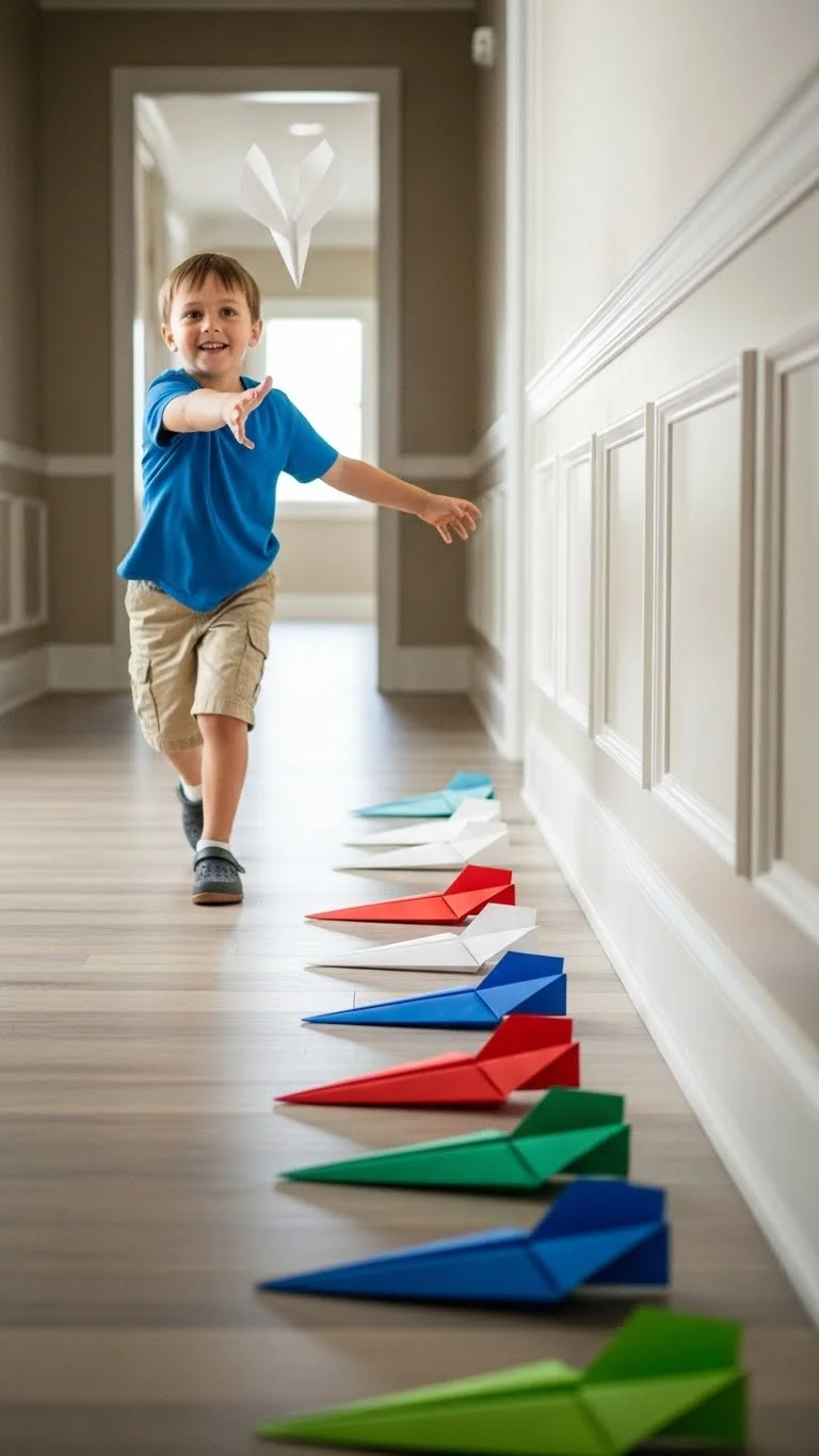 Fold simple paper airplanes. Use different types of paper if you have them. Mark a “start line” with tape. Toss each plane and see how far it flies. Kids can adjust wings and test again. Track distances using small objects as markers. This activity encourages trial and error without pressure.