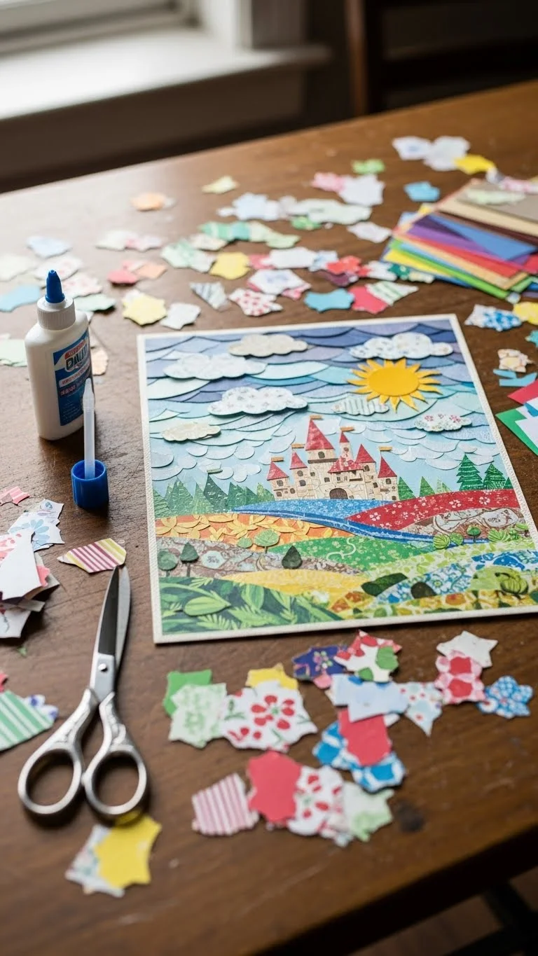Collect paper scraps from packages or magazines. Cut or tear them into shapes. Glue them onto cardboard to make a collage. Kids can create scenes or abstract shapes. Keep tools simple: glue, tape, and scissors. This uses materials you already have and fills time creatively.