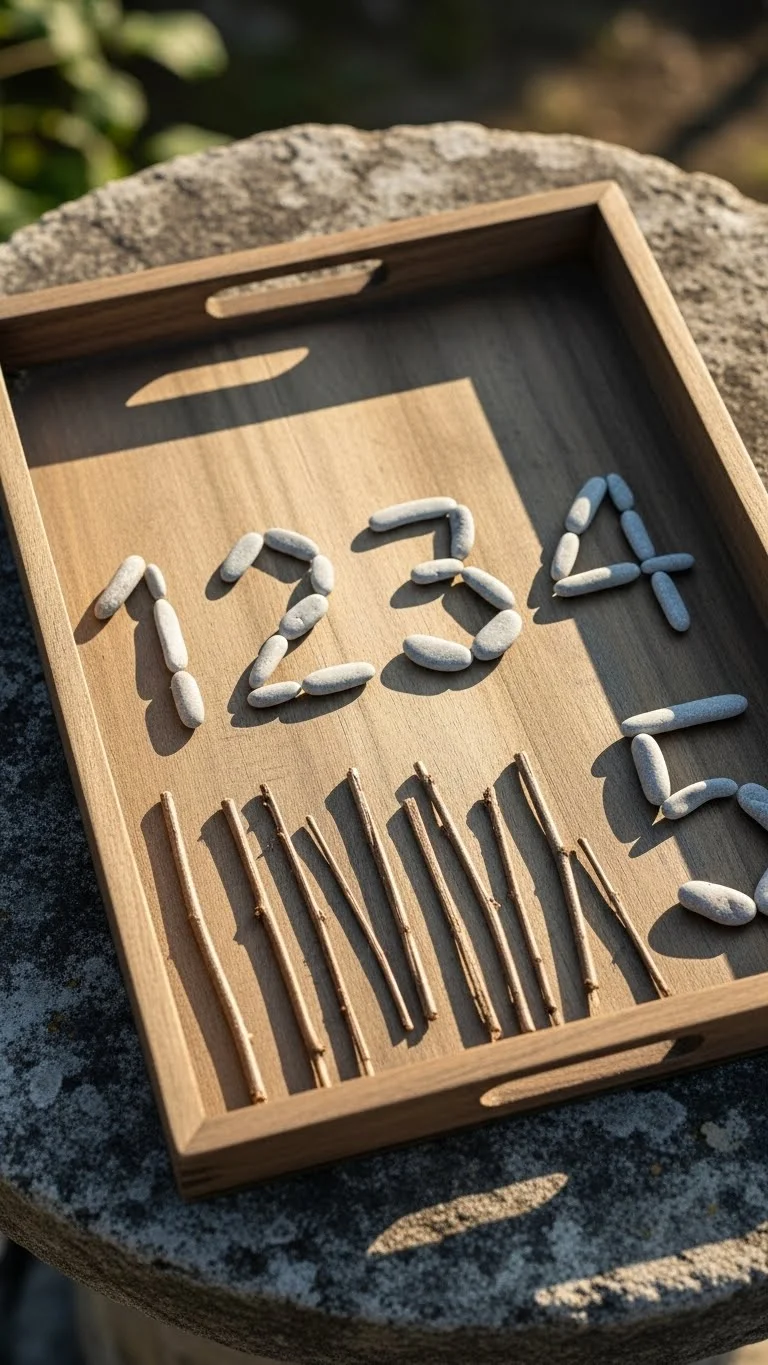 Collect sticks and stones outside. Place them on a tray. Form simple numbers or shapes. Kids can rearrange them into patterns. This activity uses natural materials that cost nothing. It also creates a quiet moment for hands-on practice.
