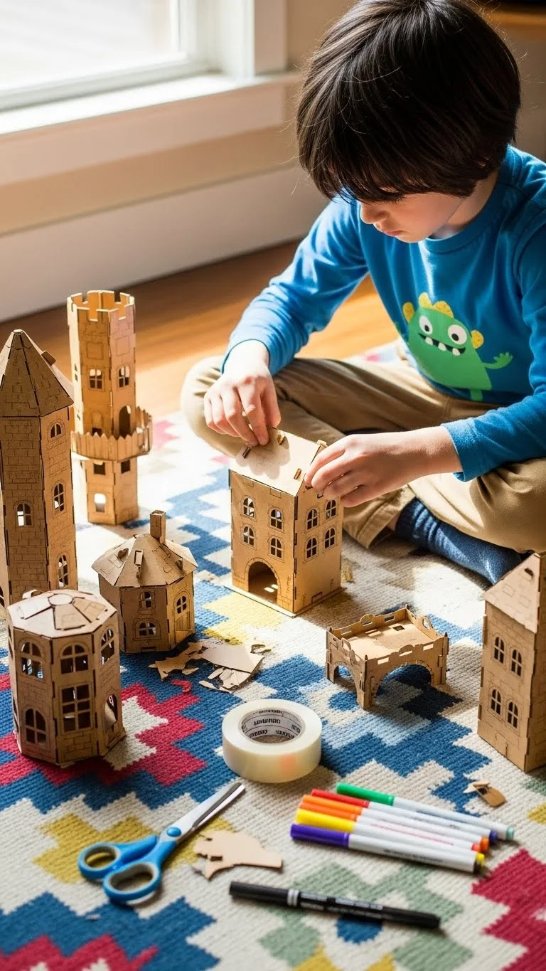 Save small boxes from deliveries. Cut doors and windows. Color or paint the outside. Arrange the buildings on the floor to form a tiny city. Add cars made from folded paper or bottle caps. Kids can rearrange the layout anytime. The project can grow over days without buying anything. It fills slow afternoons with calm, building time.