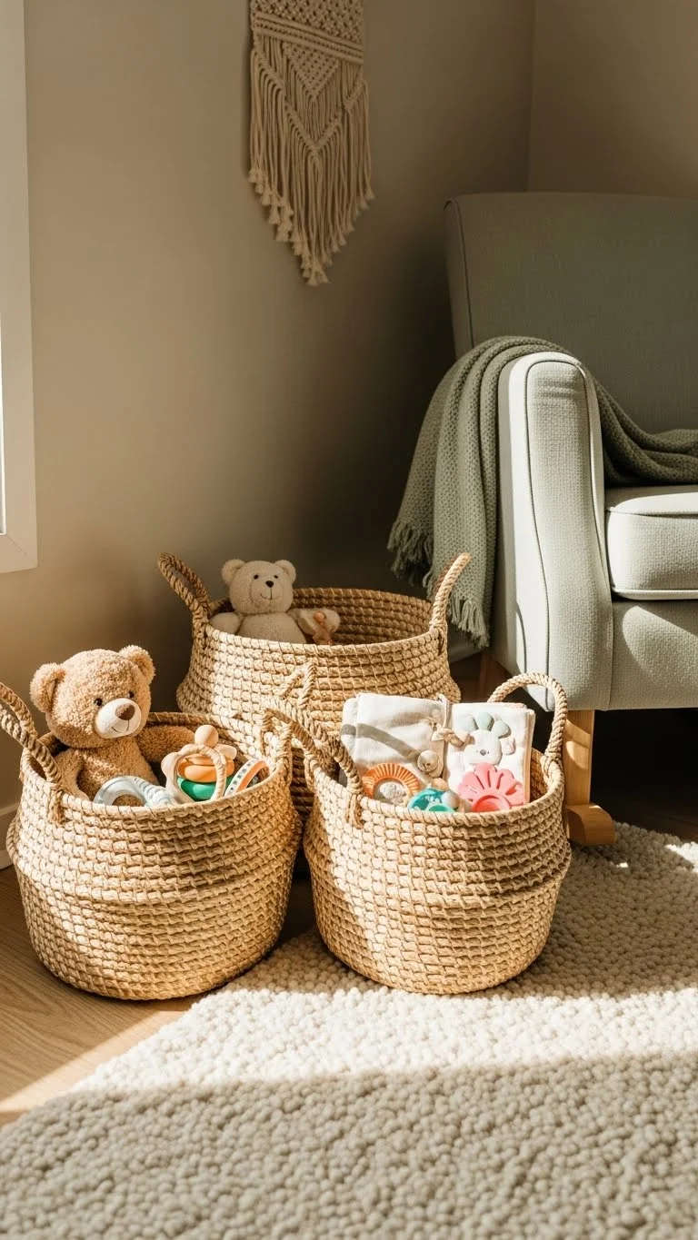Baskets are the easiest way to keep a nursery tidy without fuss. You can place them under the changing table, next to the crib, or beside the rocking chair. Pick soft, flexible baskets so they’re safe around little hands. They hide clutter and can be carried from room to room without hassle. Use one basket for toys, one for blankets, and another for small laundry. This keeps everything sorted without much thought. If you’re on a budget, grab plain baskets and add simple fabric liners for colour. You can even repurpose baskets you already have. The goal is to create quick drop zones so the room stays calm even on busy days. A few baskets can make cleanup take only seconds.