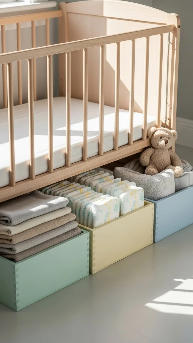 The space under the crib is valuable. Use shallow bins or rolling drawers to store extra blankets, diapers, or future clothes. Choose bins with lids if you want to keep dust out. For a budget option, repurpose long under-bed containers you already own. Keep the most-used items near the front so you don’t have to bend often. This hidden storage keeps the room from feeling crowded. You can rotate items seasonally so everything stays relevant. Once set up, this space helps keep the rest of the nursery feeling open and clear.