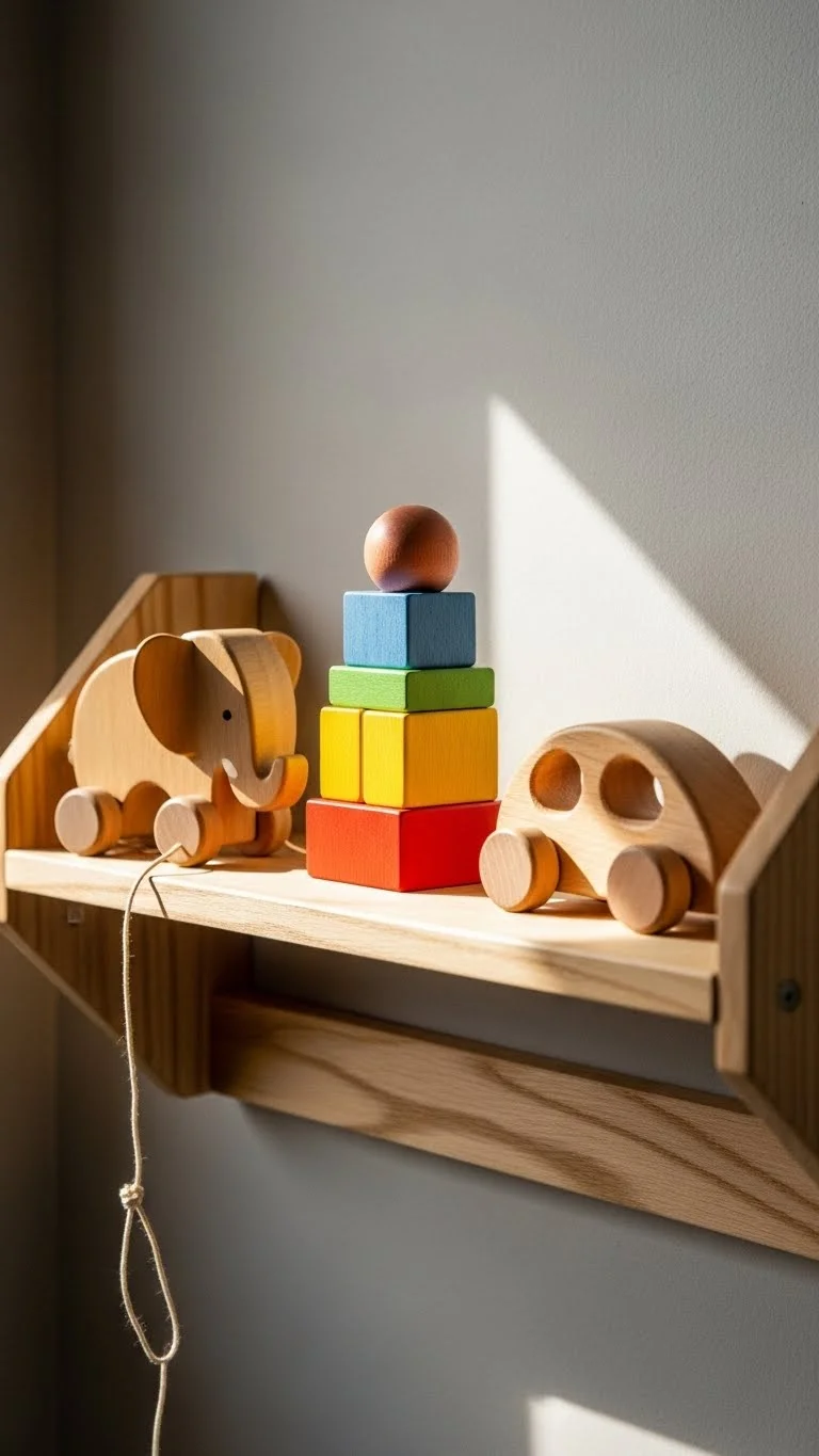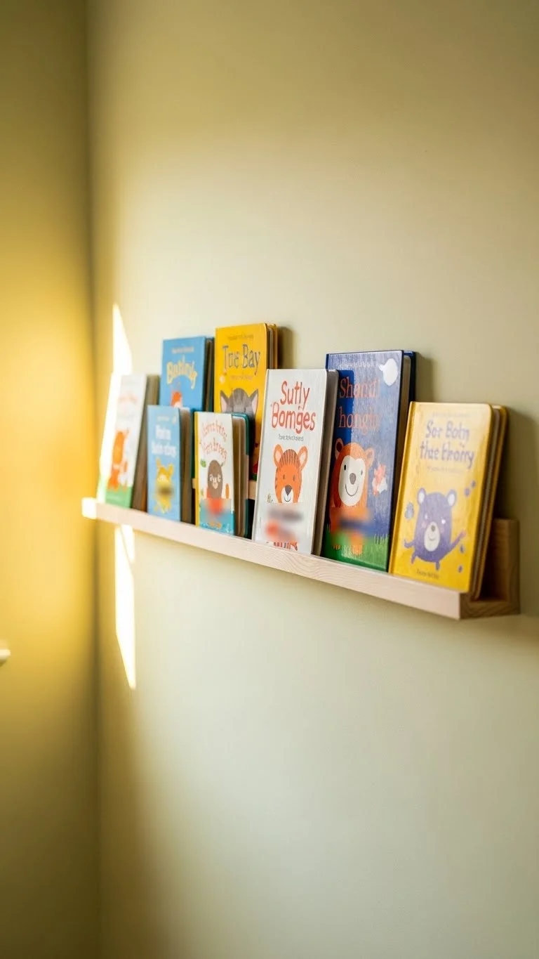 Book ledges display books beautifully while keeping them within reach. Unlike deep shelves, they don’t take up much room. Install one near the rocking chair for bedtime reading. Look for plain wood options if you prefer a natural look. For a budget choice, buy simple moulding strips and mount them as shelves. Face the books outward so the covers are easy to spot. Rotate books weekly to make reading time feel fresh. This setup encourages calm moments and keeps books from piling up in random places.