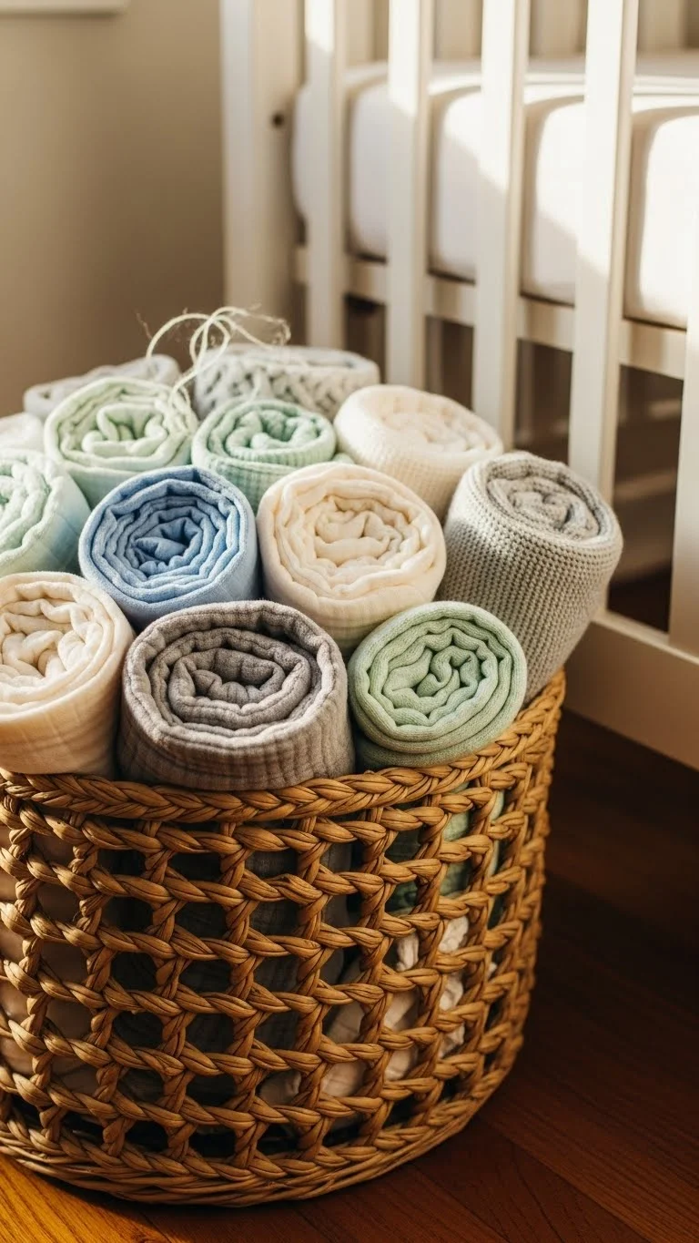 Swaddles are often used, and having them nearby helps during bedtime routines. Keep a small basket filled with neatly rolled swaddles beside the crib. Pick soft baskets that won’t scratch furniture. Roll each swaddle so you can grab one quickly without unfolding the rest. If you’re saving money, use a basket you already own. Swap out swaddles weekly so the basket stays fresh and neat. This tiny setup makes nighttime settling easier and helps keep the room uncluttered.