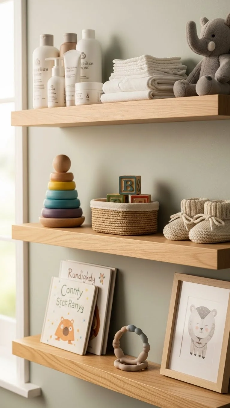 Floating shelves make use of empty wall space while keeping important items within reach. They work well above the changing table or near the feeding spot. Choose sturdy shelves with a simple design so the room doesn’t feel crowded. Use them to store wipes, creams, burp cloths, or small toys. Add a small plant or framed photo to keep the space warm without clutter. If you’re on a budget, you can paint basic wood planks and create your own shelves. Keep heavier objects low and light items higher for safety. Group items in small trays so everything stays neat. This little upgrade keeps your hands free and your mind calmer during busy moments.