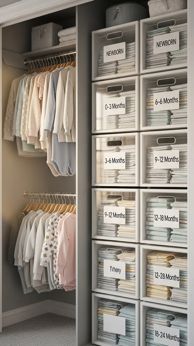 Babies grow fast, and it’s easy to lose track of clothing sizes. Clear bins help you see everything at a glance. Sort clothes into bins labelled “0–3,” “3–6,” and so on. Keep the current size at eye level and future sizes on higher shelves. This helps you avoid buying duplicates or forgetting cute outfits. Use smaller bins for socks, hats, and mittens so tiny pieces don’t disappear. Reuse food storage bins or plastic containers if you want a cheaper option. Fold clothes loosely so they stay unwrinkled and easy to grab. When your baby moves to a new size, simply rotate the bins. This simple setup keeps the closet neat and helps you stay ahead of growth spurts.