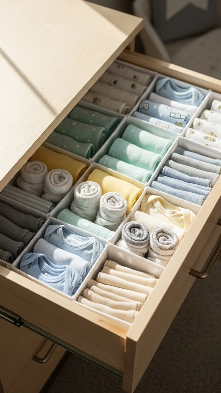 Baby clothes are tiny, and they scatter easily. Drawer dividers help keep onesies, socks, bibs, and pyjamas separated. Choose dividers that can adjust as your baby grows and clothing needs change. You can also create your own dividers using cut cardboard wrapped in fabric. This saves money and lets you pick the colours. Keep each section small so items don’t mix. Fold clothes like small squares and place them upright so you can see everything at once. This approach saves time during morning routines and keeps drawers from overflowing. A few dividers go a long way in keeping everyday items easy to grab.