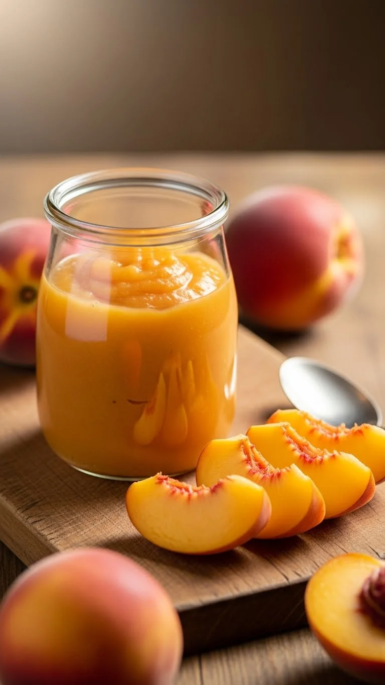 Stew peeled peaches with a splash of water until tender. Blend until smooth. Use fresh or frozen peaches, depending on season and price. Store in jars for two days or freeze for later. This purée mixes nicely with yoghurt or oatmeal. It also works well on its own as a sweet, simple snack.
