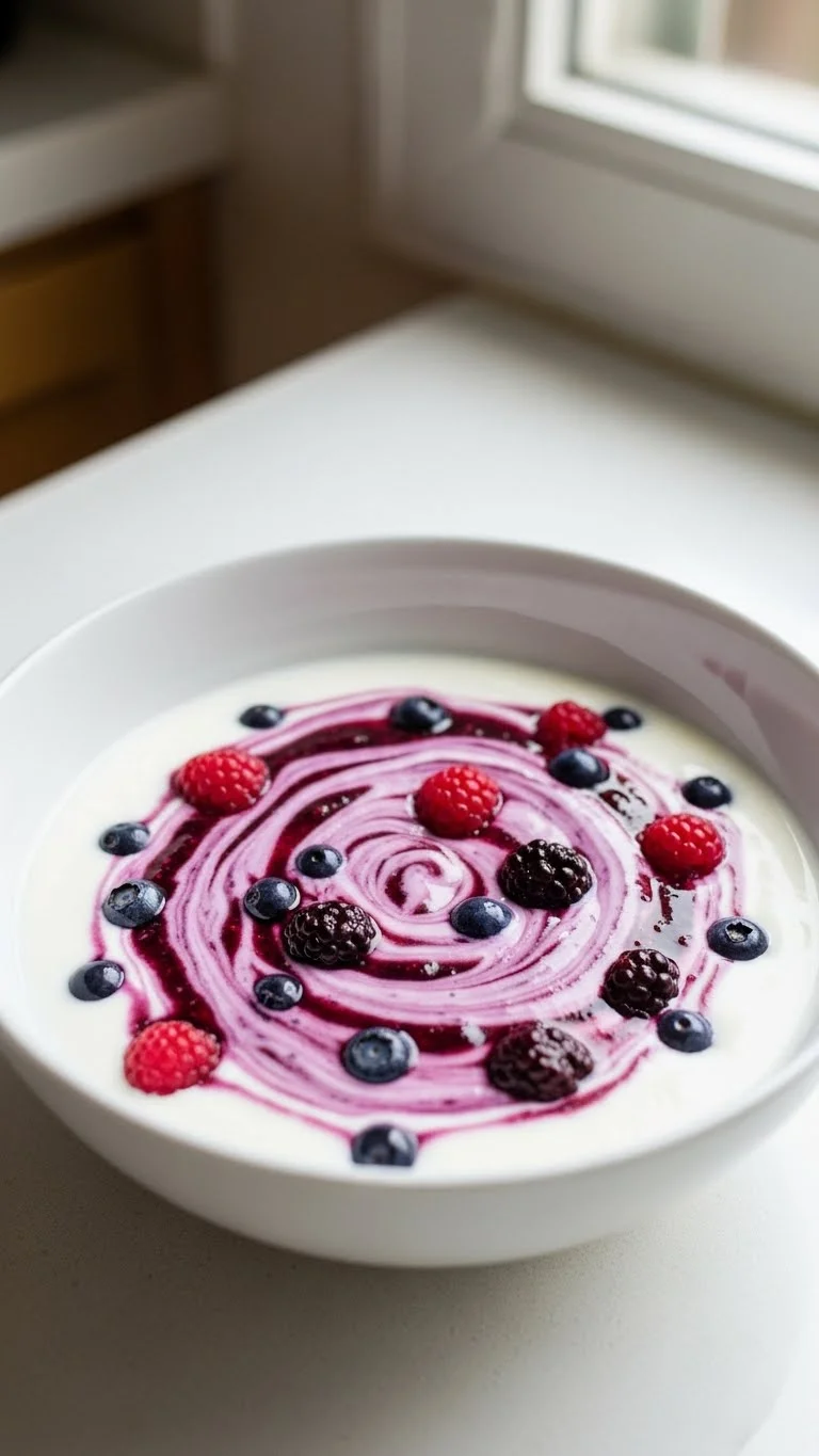Mash soft berries and swirl into plain yoghurt for older babies. Use frozen berries if fresh ones cost more. Prepare small servings because yoghurt doesn’t store well after mixing. This makes an easy snack or breakfast. Adjust the berry amount based on sweetness. Serve chilled for a refreshing texture.