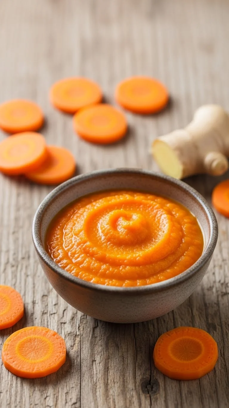 Steam carrots until completely soft. Add the tiniest shaving of ginger for warmth. Blend with water to your preferred texture. Ginger adds flavour without making the dish overwhelming. Carrots are cheap and easy to prep in large batches. Freeze the purée in small cups or silicone trays for later. This mixture pairs well with potatoes or squash if you want variety. Use leftover carrots from family meals to save time. Serve warm for a cosy flavour on cooler days. The ginger gives a subtle twist without being strong.