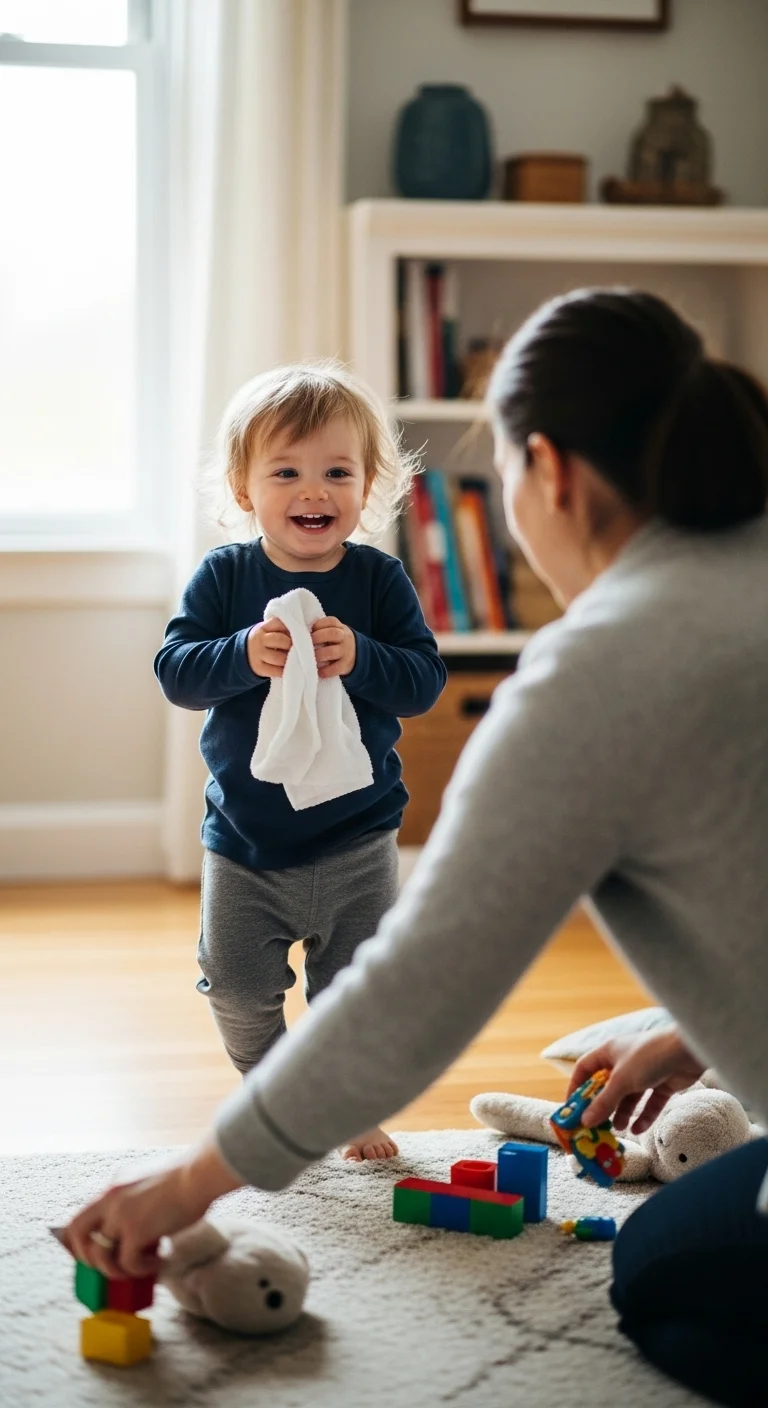 Many tantrums come from toddlers wanting to feel capable. Offering a tiny “job” can redirect their energy. Ask them to hand you a washcloth, carry a sock to the laundry basket, or put a toy in a bin. Use simple language: “Your job is to carry this.” The task doesn’t have to matter in an adult sense—it just needs to feel important to your child. Keep jobs small and success easy. During tense moments, giving a job creates a sense of control and reduces frustration. No supplies needed—use whatever is already around you.