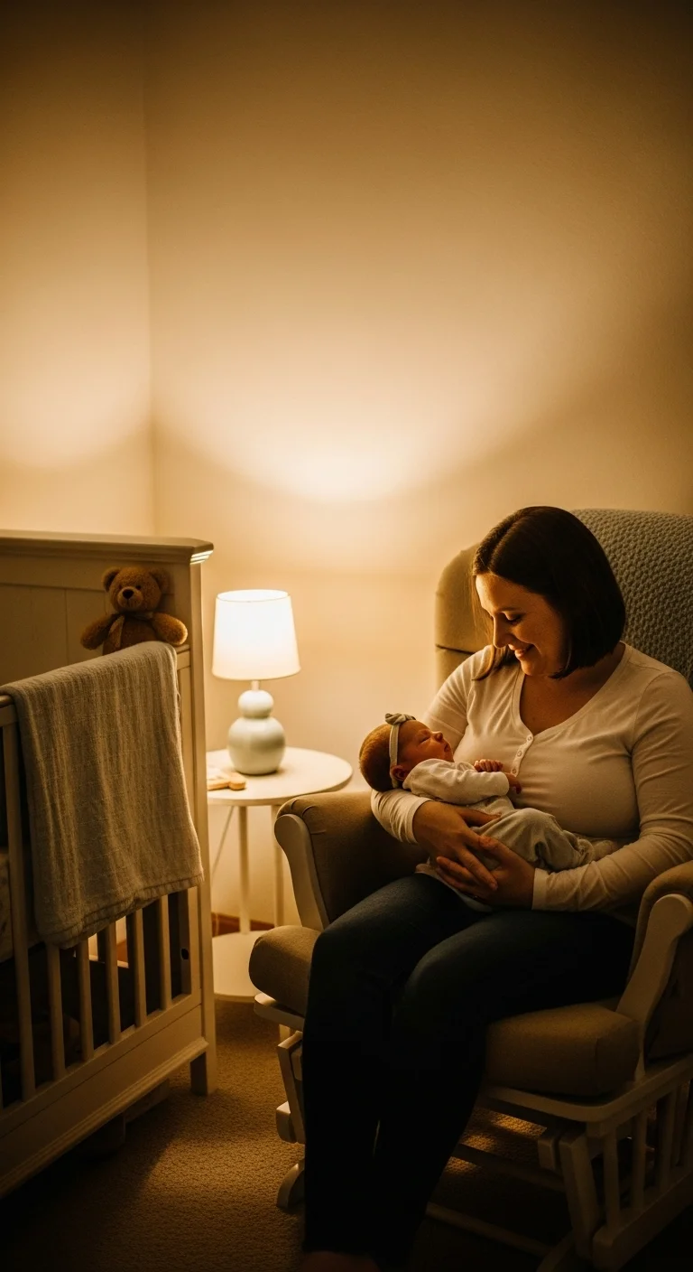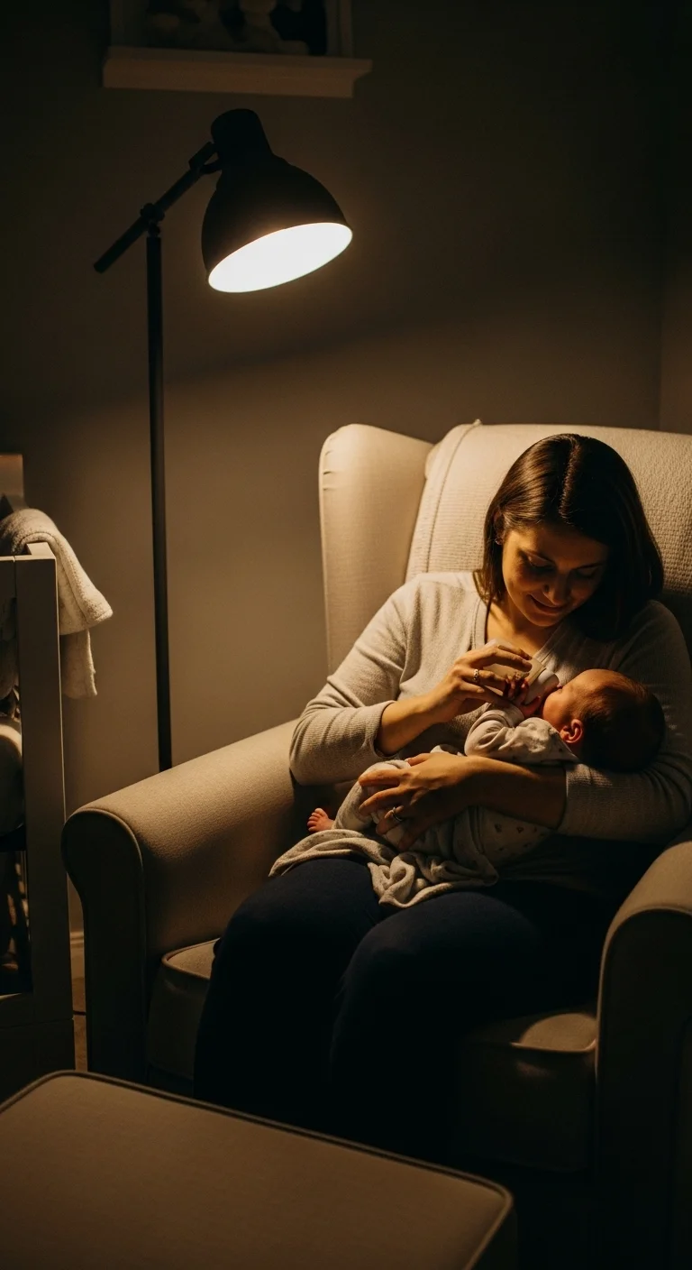 Bright lights can wake your baby completely, making it harder to fall back asleep. Use a dim lamp or a soft night-light instead. This helps your baby stay calm and drowsy after feeding. A cheap plug-in night-light works just fine. If you want something even simpler, keep your phone flashlight pointed toward the floor instead of your baby. Keep your voice low and movements slow. Change the diaper only if needed. This helps the feeding remain calming. Babies often fall back asleep faster when the environment stays quiet and dark. A low-light routine also helps you feel more relaxed, which makes nighttime moments smoother for both of you.