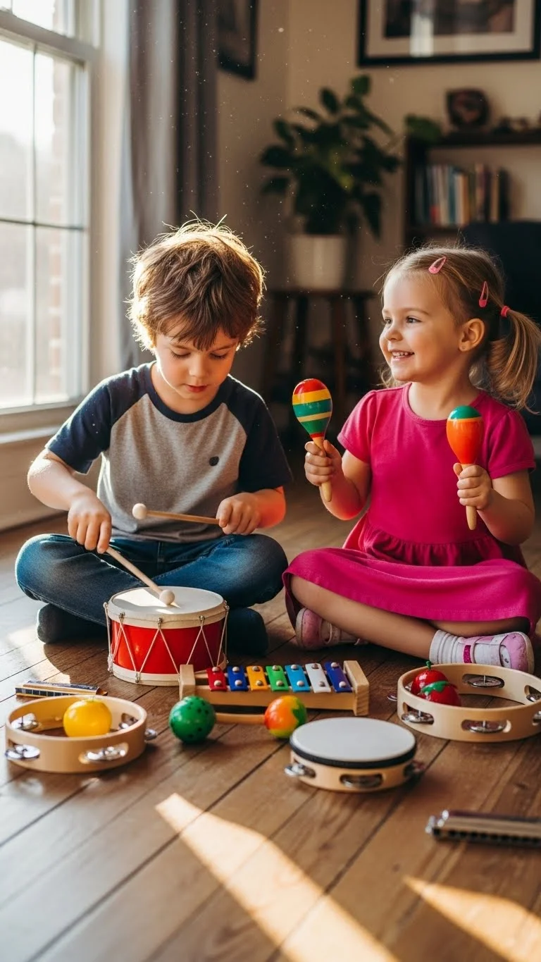 Music naturally brings kids together. Lay out simple instruments or homemade shakers made from rice-filled containers. Let them create a “band” with each child choosing a sound. Encourage them to take turns leading a rhythm. Keep it playful, not perfect. This activity helps them listen to each other’s timing and ideas. Clean-up is easy, and homemade instruments keep costs low.