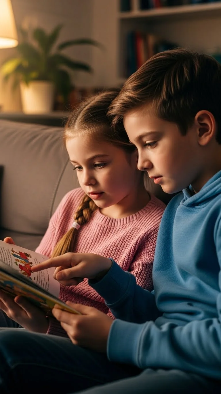 Invite your kids to read together. Older kids can read aloud, while younger ones turn pages or point to pictures. If both are young, let them “read” by describing what they see. Choose short, fun books to keep interest high. Use pillows and blankets to create a cosy setup. You don’t need new books—library options or old favourites work well. Shared reading strengthens communication and creates a calm moment in their day.