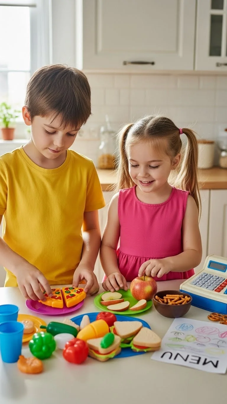 Turn your kitchen into a pretend restaurant. One child can be the chef while the other acts as the server. Use simple foods like crackers, apple slices, or toast. They can decorate plates with safe toppings. Switch roles after a few minutes so both feel included. This activity encourages teamwork and reduces arguments because each child gets equal time. It’s budget-friendly, playful, and easy to reset.