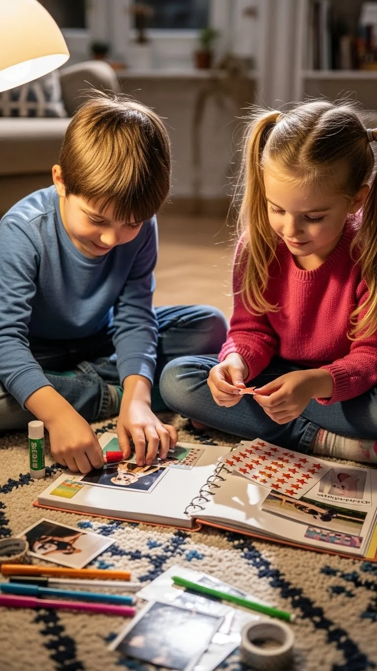 Start a memory book where they add drawings, photos, or small notes about fun moments. Use a notebook you already have. They can each take turns filling a page. This gives them a shared project that grows over time. Let them decorate pages with scraps, stickers, or magazine cutouts. It becomes a meaningful keepsake and also strengthens the connection through shared reflection.