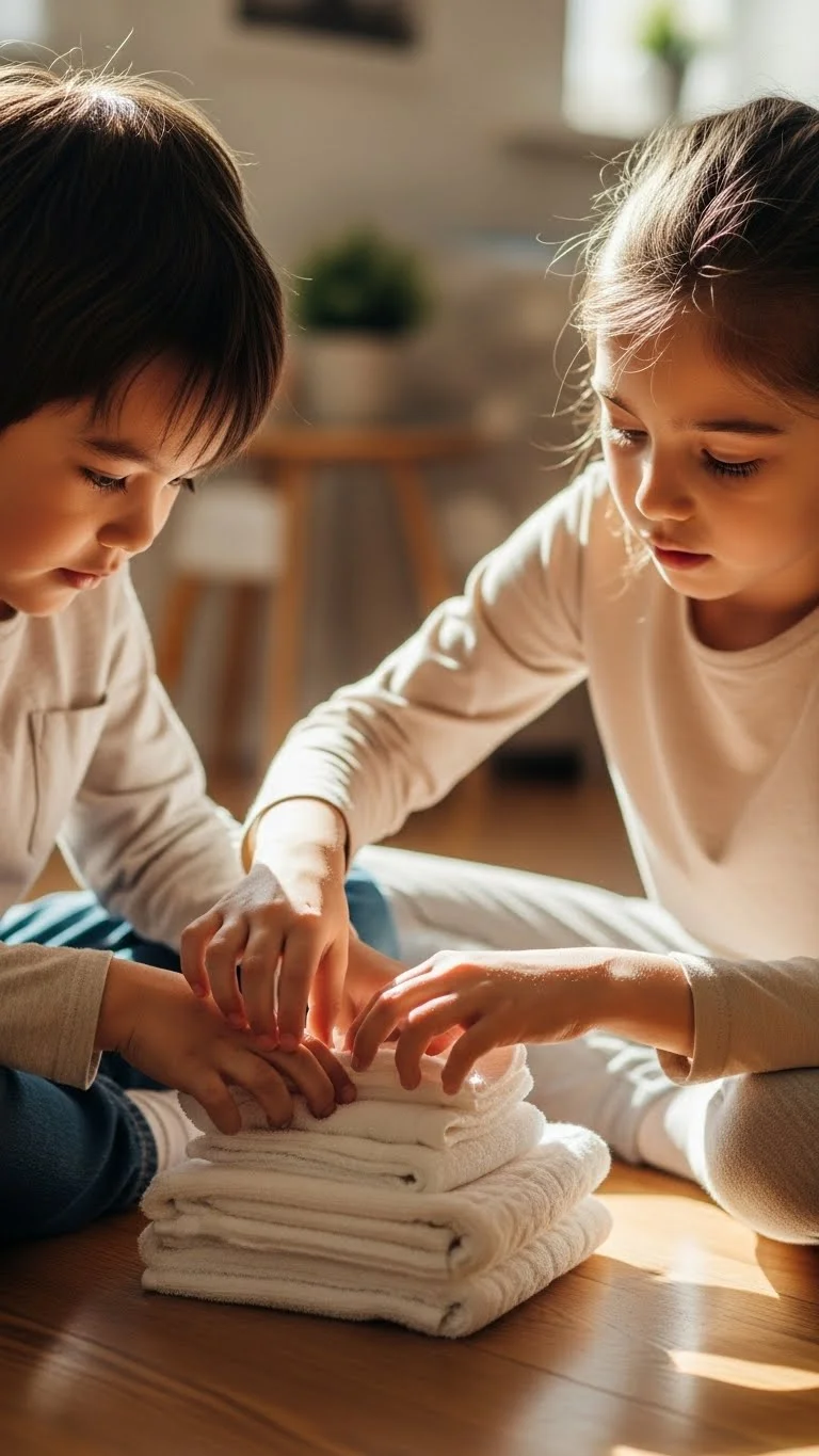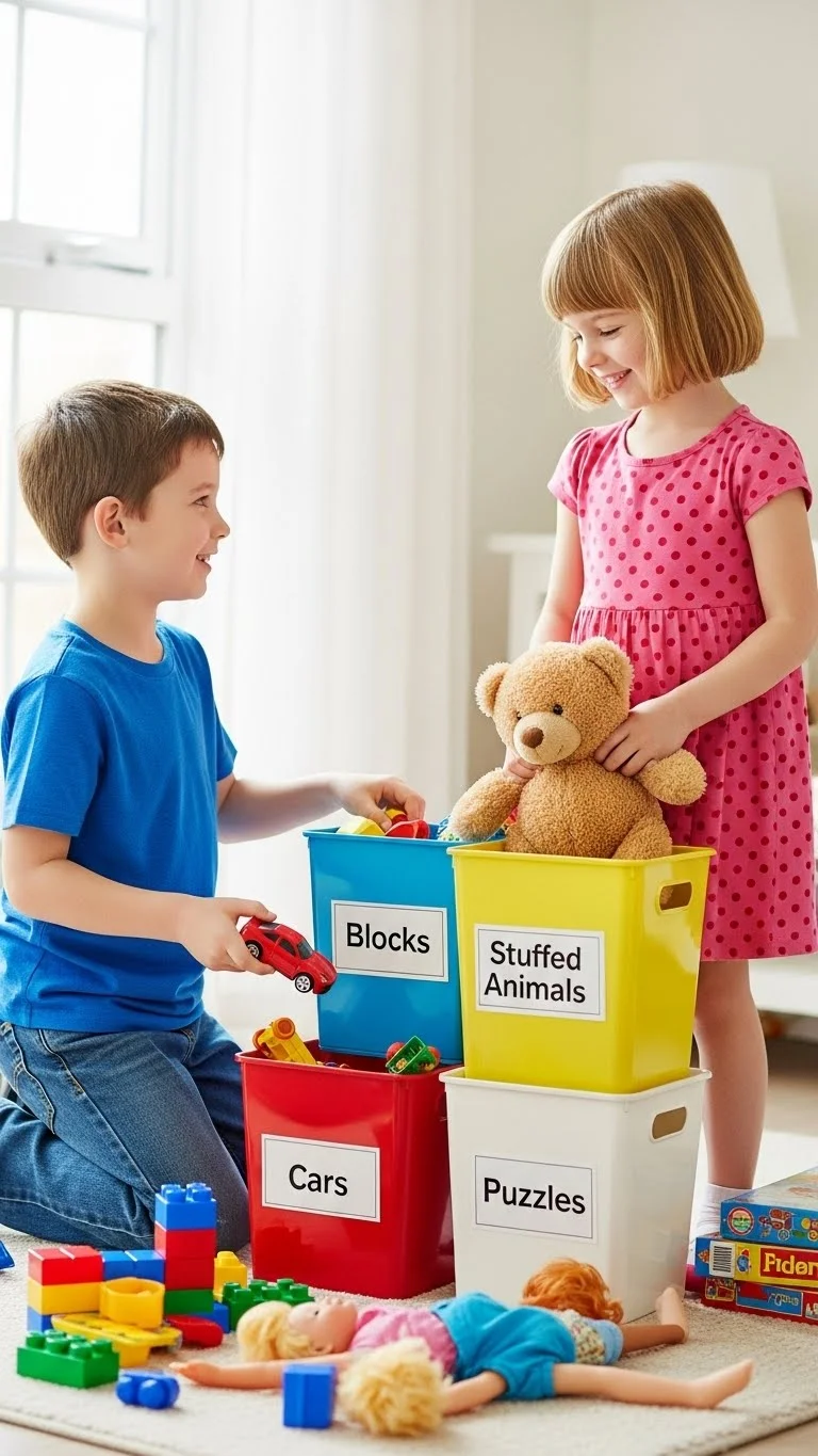 Turn cleanup into a quick challenge they do together. Give them two baskets and set a short timer. They must work as a team to fill both. This encourages cooperation instead of whining. Use labelled bins or simple boxes. When they finish, thank them and let them choose a small reward, like choosing a show or a short game. It keeps responsibilities light and shared.