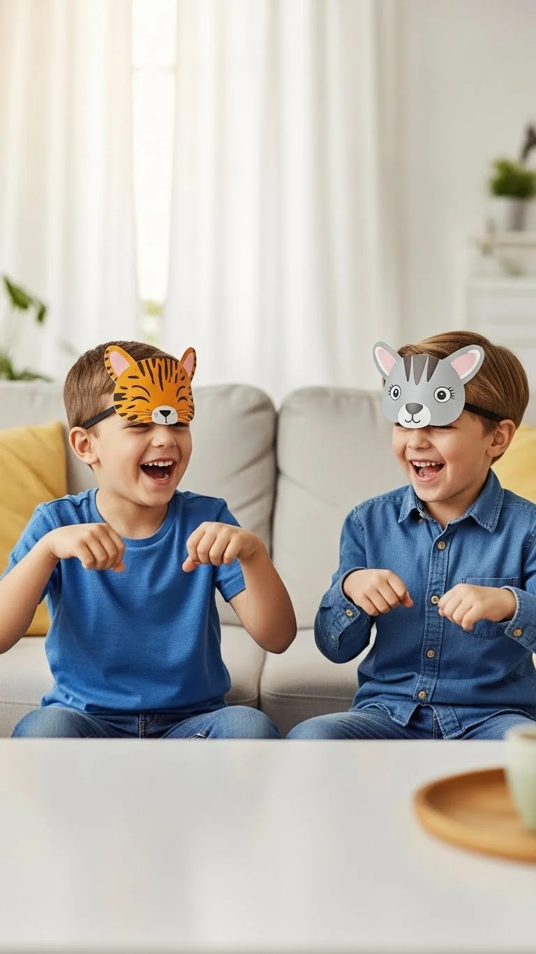 Play charades where both kids act together while you guess. Pick simple prompts like animals, jobs, or actions. They must coordinate movements and communicate nonverbally. This builds teamwork and encourages playful silliness. No materials needed. Keep the rounds short so no one feels frustrated. This is a great activity for rainy days or evenings.