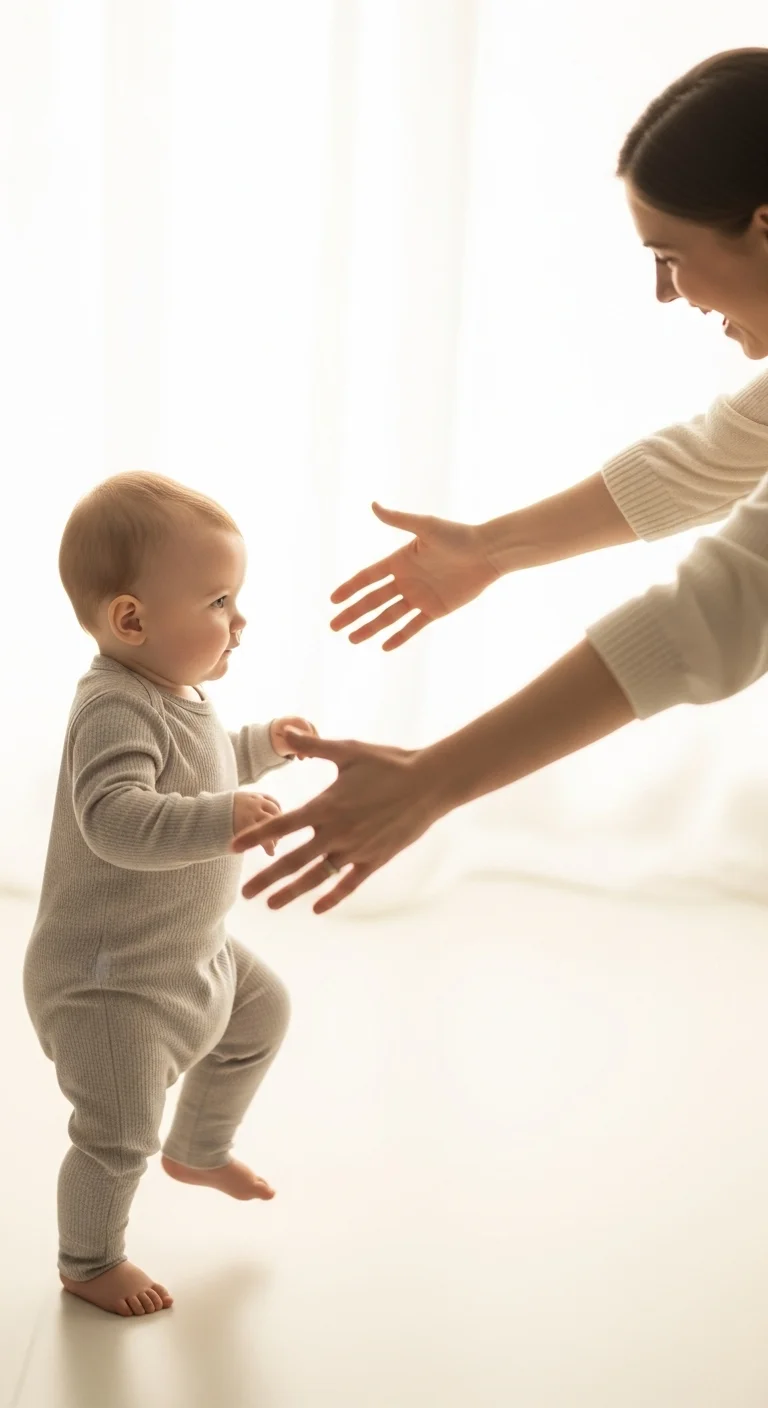 The first steps happen unexpectedly. Start by letting your baby stand between your legs while you support lightly. Hold out a toy to encourage movement. Keep floors clear and soft. Avoid walkers and jumpers—they aren’t needed. Offer short sessions to prevent fatigue. Celebrate each attempt without pressure. Use everyday rooms as practice spaces.