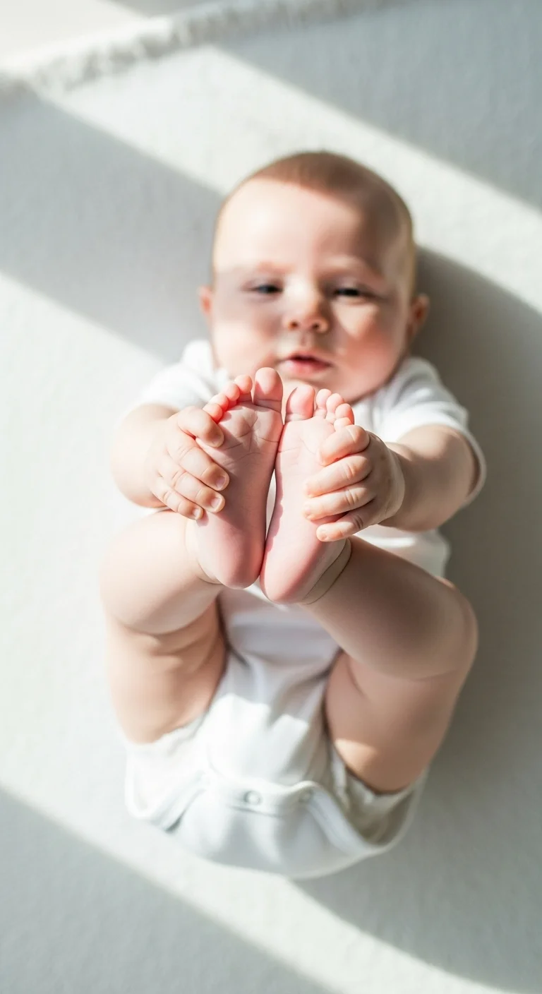 This milestone often appears during diaper-free play. Lay your baby on a soft blanket with legs free to kick. They may start grabbing their toes and rocking side to side. Keep the space warm so they stay comfortable without heavy clothing. Add a small mirror nearby to keep them curious. Simple songs or gentle tapping on their feet can spark movement. This playful moment helps with flexibility and coordination.