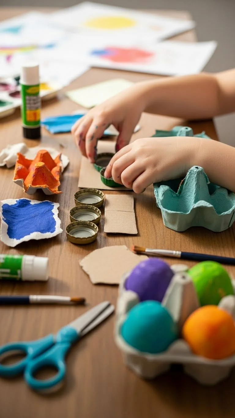 Collect clean recyclables in a bin and turn them into a craft station. Bottle caps, egg cartons, cardboard scraps, yarn pieces, and paper tubes all work. Place them on a table with tape and glue. Let kids decide what to build. A robot, animal, spaceship, or “city” often pops up without planning. Kids enjoy sorting shapes and stacking pieces. The randomness keeps it fun and surprising. If you want, offer markers to add features. Avoid over-directing; the freedom helps them stay absorbed. This activity lasts a long time because they keep discovering new materials in the bin. Add items over time, like ribbons or fabric scraps. Cleanup is simple—save anything still usable in the bin for another day. This becomes an ongoing project space that keeps interest high without extra cost.