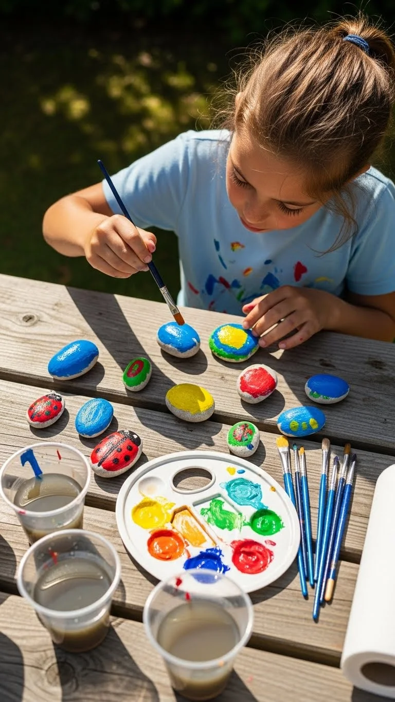 Gather a handful of smooth rocks from the yard or a park. Set them on a table with washable paint or paint pens. Kids enjoy turning each rock into a tiny creature, a pattern, or a simple happy face. Keep cleanup easy by placing everything on a piece of old newspaper or cardboard. If paint isn’t available, markers still work well. Kids often get hooked on decorating multiple rocks because each one feels like a small project. A bowl of completed rocks makes a fun display on a shelf or porch. Some kids like hiding painted rocks around the neighborhood to surprise others. This adds a bit of adventure and keeps the activity going longer. It’s simple, low-cost, and always fun because no two rocks turn out the same.