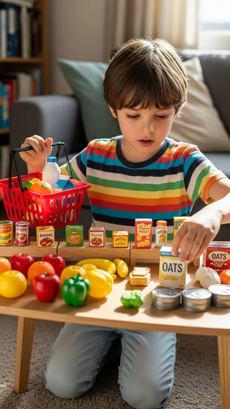 Turn a corner of the room into a tiny shop. Use empty boxes, safe cans, or toy food to stock the “shelves.” Give kids a small basket and scrap paper for receipts. They enjoy scanning items, bagging them, and rearranging the display. A cardboard box can become the checkout counter. This activity fills a long stretch of time because kids shift between shopper, cashier, and manager roles. Add play money if you have it, or draw simple bills on paper. Kids often stay busy adjusting prices, lining up items, and inviting family members to “buy” things. Cleanup is quick because everything goes back into one bin.