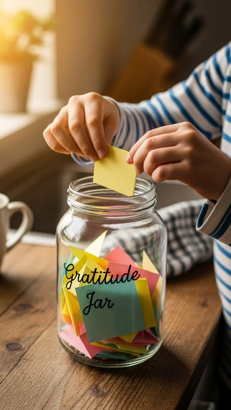 A gratitude jar helps shift focus gently toward positive moments. Use a jar and small pieces of paper. Each day, write down one good thing that happened, no matter how small. Read the notes together once a week. Keep the tone light and pressure-free. There’s no need to force gratitude during hard days. Use recycled paper to keep it simple. This practice supports balanced thinking and emotional resilience. Over time, children begin to notice good moments naturally. A gratitude jar teaches kids that joy and calm can exist alongside worry, helping them build a healthier emotional perspective.