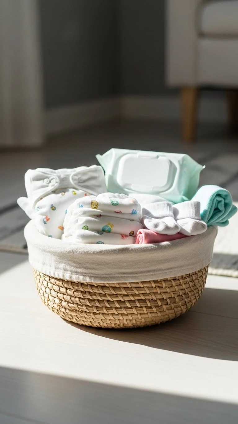 In the first weeks, even small tasks can feel overwhelming. Walking across the house for a diaper, wipes, or a fresh outfit can suddenly feel exhausting—especially when your baby is already crying. Placing a small basket of essentials in each main room saves you time and energy. Fill it with diapers, wipes, burp cloths, a spare outfit, and anything else you use often. When everything is within reach, changes feel calmer and quicker. You don’t need fancy storage. Old tote bags, cardboard boxes, or unused drawers work just as well. This is about convenience, not aesthetics. This habit reduces stress because you don’t have to think—you just reach. Less thinking means less overwhelm. When you’re tired, small systems like this can make a big difference. Prepared spaces create calmer moments. And calmer moments help you feel more in control.