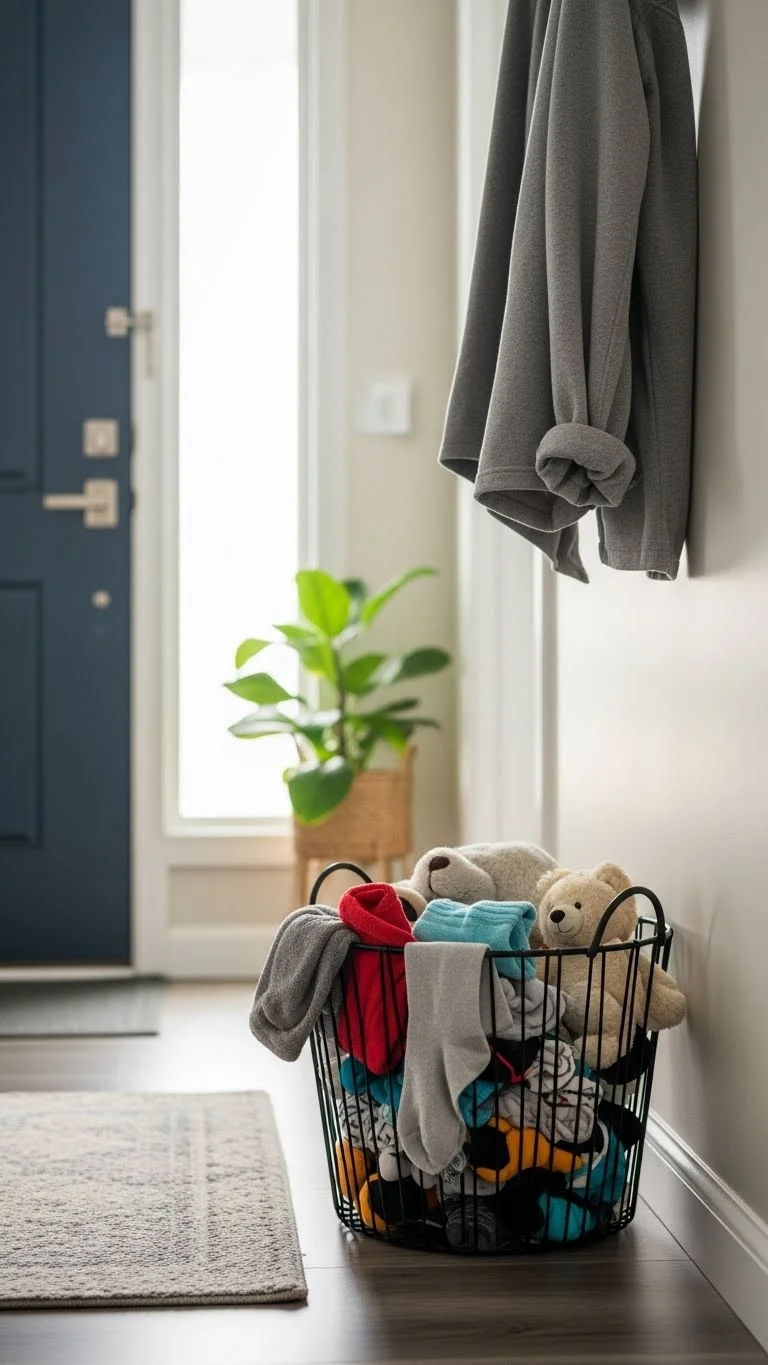 Lost items cause stress and blame. A shared basket solves that. Any found item goes straight into the basket. No searching. No lectures. Everyone checks it daily or weekly. This keeps clutter from spreading and saves time. A cardboard box or old laundry bin works well. Kids learn responsibility by checking for their belongings regularly. Items return faster, and arguments fade. One simple spot brings order without turning it into a big task.